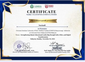Malaysia – Empat dosen STIT YPI Al-Yaqin Sijunjung turut memberikan kontribusi penting dalam Internasional Conference on Islamic Education UPM–UIMSYA 03/11/2025 yang diselenggarakan oleh Fakulti Pengajian Pendidikan Universiti Putra Malaysia (UPM) bekerja sama dengan UIMSYA – Universitas KH. Muhtar Syafaat, Banyuwangi Jawa Timur-Indonesia. Para dosen tersebut berhasil menulis artikel ilmiah yang diterbitkan dalam jurnal akademik UPM pada konferensi bertema “Strengthening Islamic Educational Leadership Through Faith, Ethics, and Digital Transformation.” di antara dosen tersebut adalah Awang Ringgit, M. Sy, Odsisa Putera, M. Pd.I, Yusriandi, M. Hum. dan Emilza Tri Murni, MA. Dua di antaranya diundang secara khusus sebagai pembentang dalam sesi seminar internasional di tempat tersebut.